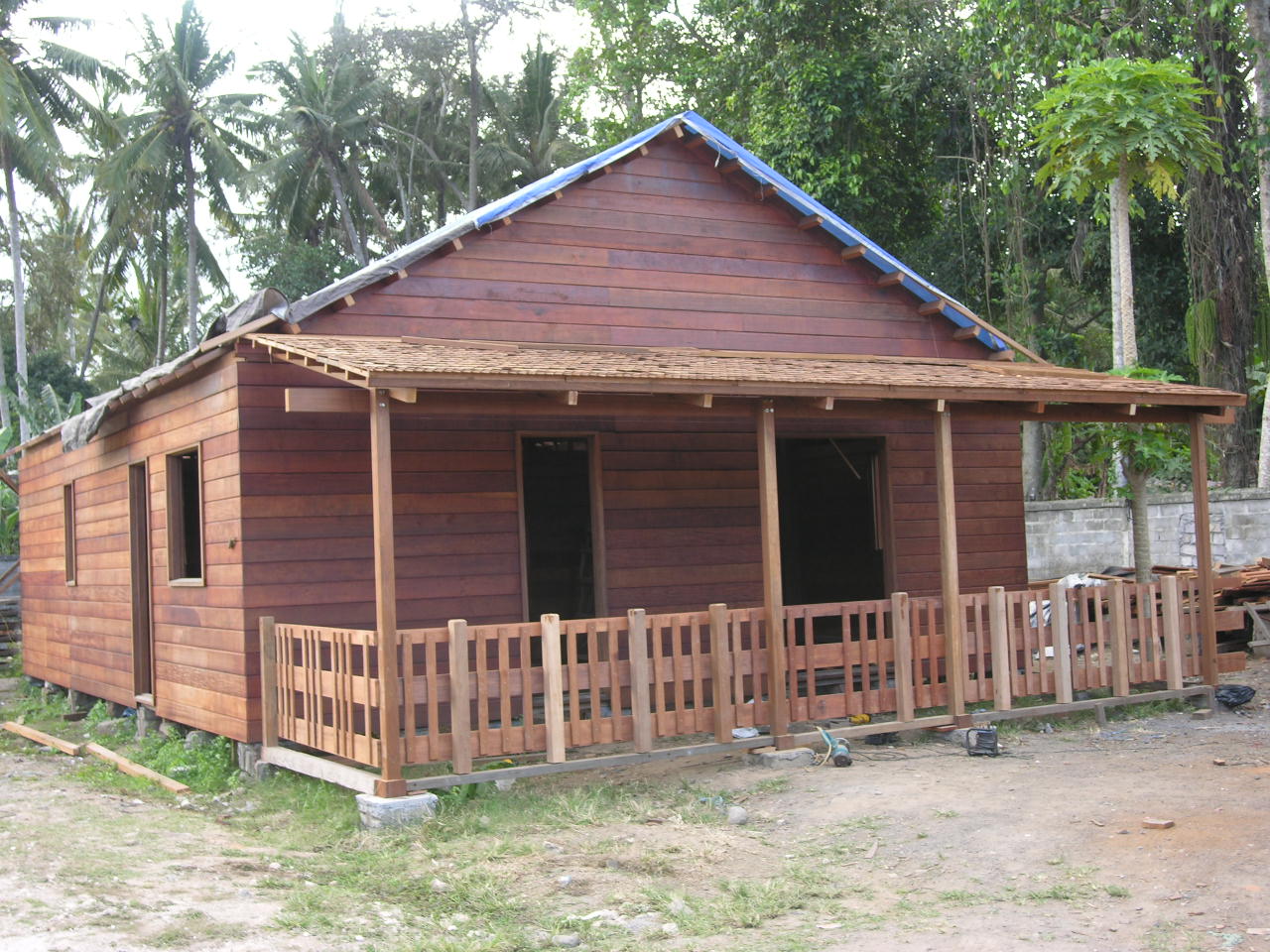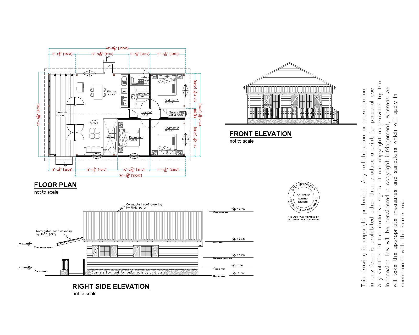 Large unit: (option 1) Total net. interior sided area: 121.2 m2 (1,276 sqft) Building footprint area: 10.25 x 8.00 meter (45' x 29' - 5") Roof edge footprint area: 17.30 x 8.85 meter (75' - 3 /32" x 29' - 1/3") Veranda: 9 x 2.5 meters.