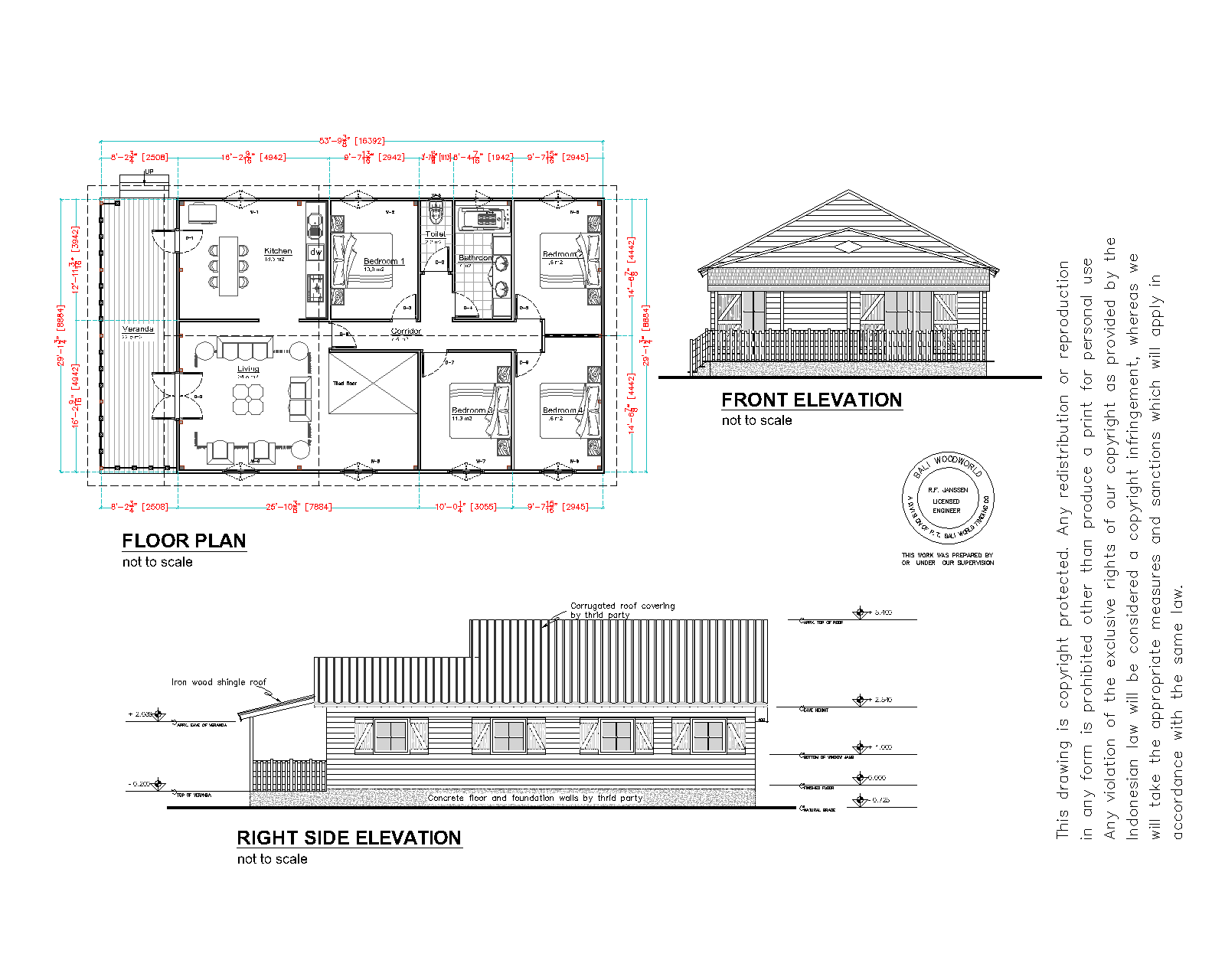 Small unit: (option2) Total net. interior sided area: 84.9 m2 (895 sqft) Building footprint area: 4.90 x 5.38 meter (16' x 17' - 6") Roof edge footprint area: 11.40 x 8.80 meter (37' - 2" x 29' - 1") Veranda: 4.40 x 0.95 meters